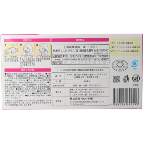 使い捨て不織布 三層サージカルマスク お徳用タイプ 女性・子供用サイズ 50枚入